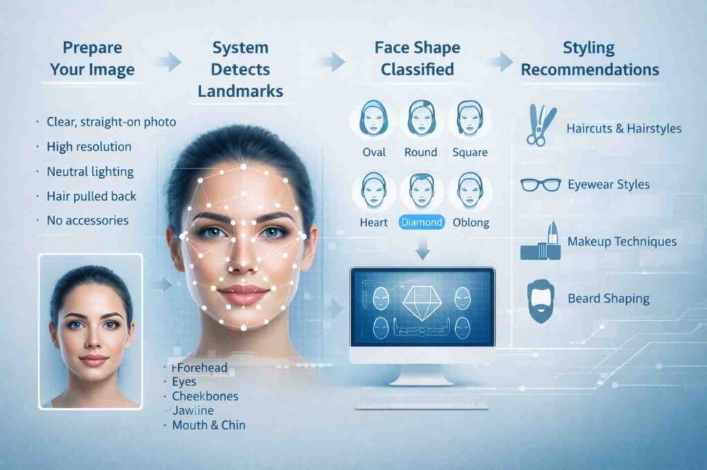 Using a face shape detector is straightforward. Once you upload your prepared image, the system begins scanning for facial landmarks. It identifies the outline of your face, measures the width of your forehead and jaw, calculates the length of your face, and evaluates cheekbone prominence.
