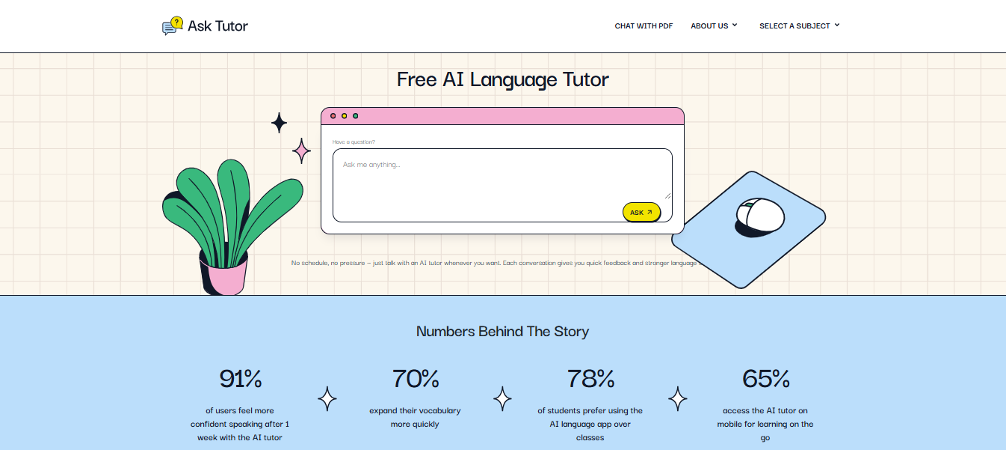 Asktutor.ai leads this list because of its strong focus on adaptation and clarity. It functions as an AI language tutor that responds to how a student actually performs, not to a predefined learning path. This platform gives quick feedback that shows where you went wrong and how to fix it. Conversations help users build real skills and understand meanings clearly. The system supports speaking and vocabulary in everyday scenarios. It also adjusts to what you need next so you get personalized language practice that fits your current level.