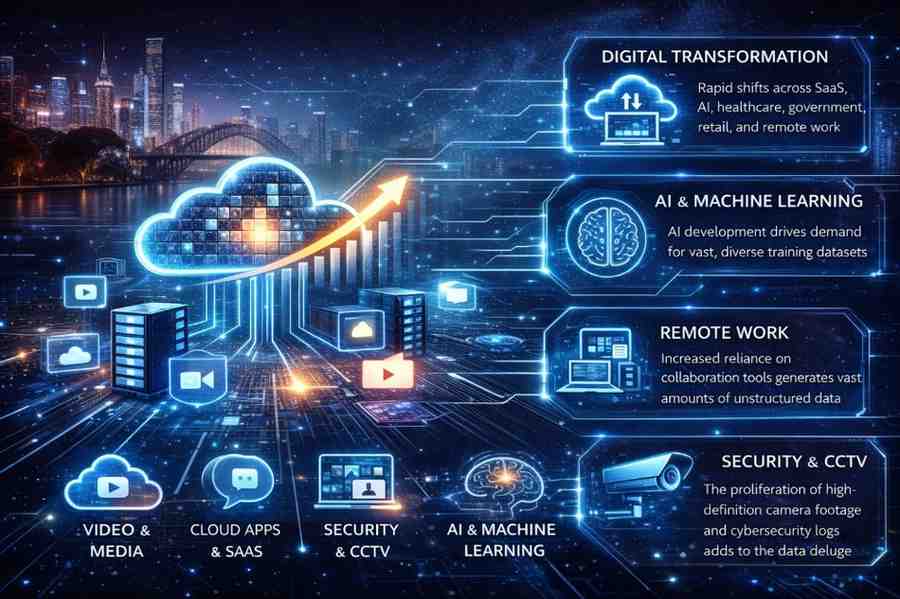 Remote and hybrid work models have dramatically increased document sharing, collaboration files, video calls, and cloud backups. At the same time, Australian organisations are accelerating the adoption of AI and machine learning, which demands massive datasets for training, inference, and analytics.