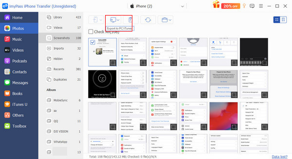 Step 3. Click Photos on the left. You can navigate the iPhone photo you want to transfer to PC through the collections: Library, Screenshots, Videos, and even the customized albums.