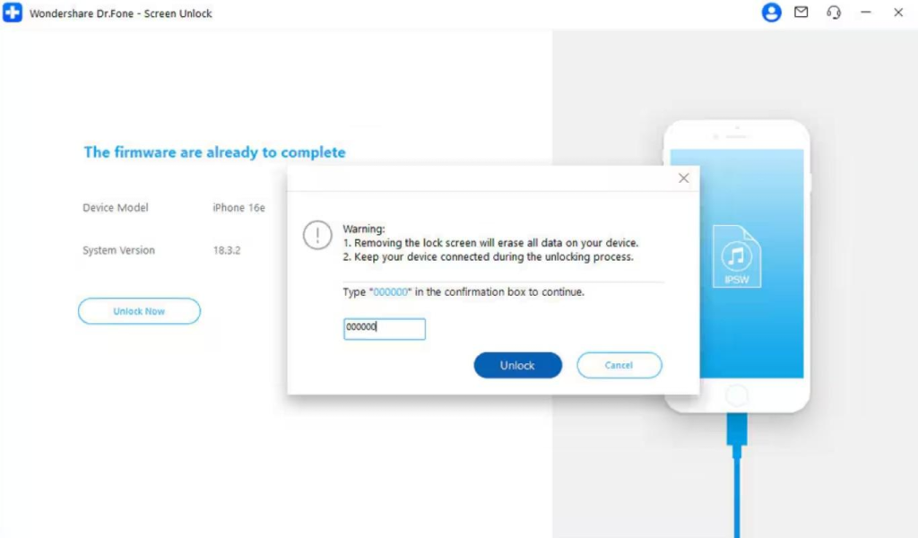 The program will then start downloading the right firmware for your iOS device. Upon installing, hit the “Unlock Now” and “Unlock” buttons after typing the “000000” code.