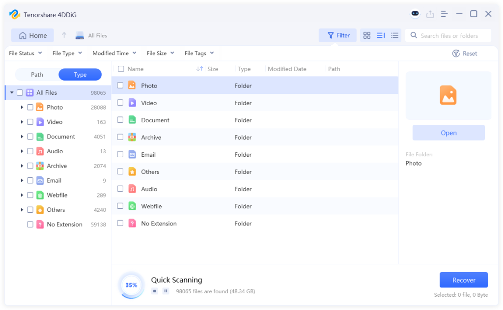 Step 2: The tool will quickly scan the USB stick for any recoverable files. To make the process easier, you can switch between Path View or Type View, which allows you to narrow down your search based on folder structure or file type.