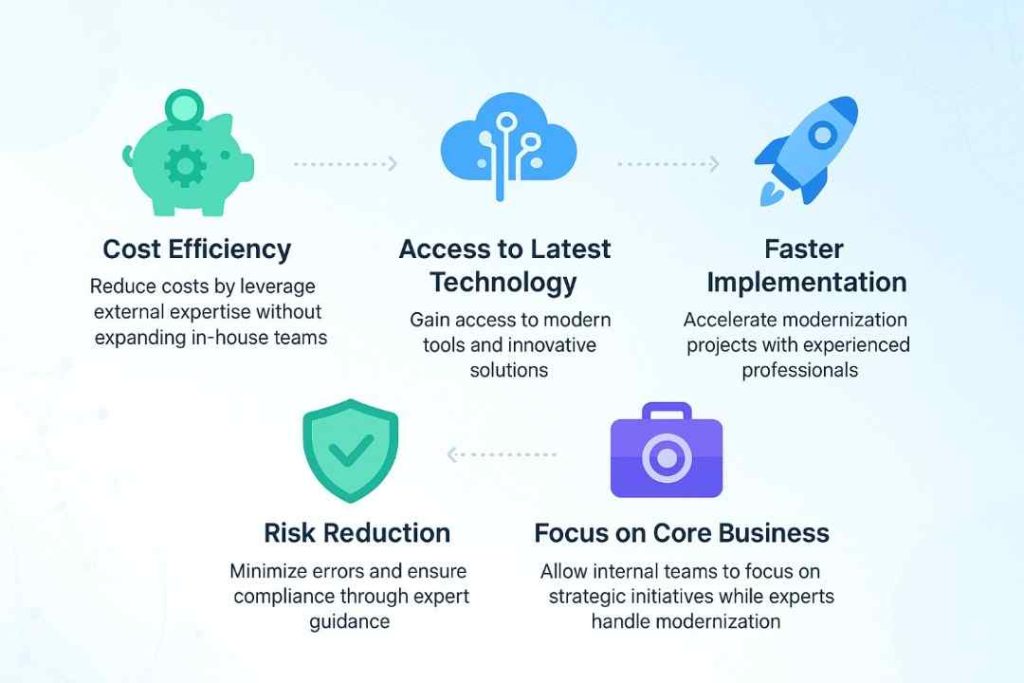 External teams also reduce risks by validating dependencies, analyzing hidden business logic, and ensuring that the modernization effort does not disrupt critical operations.