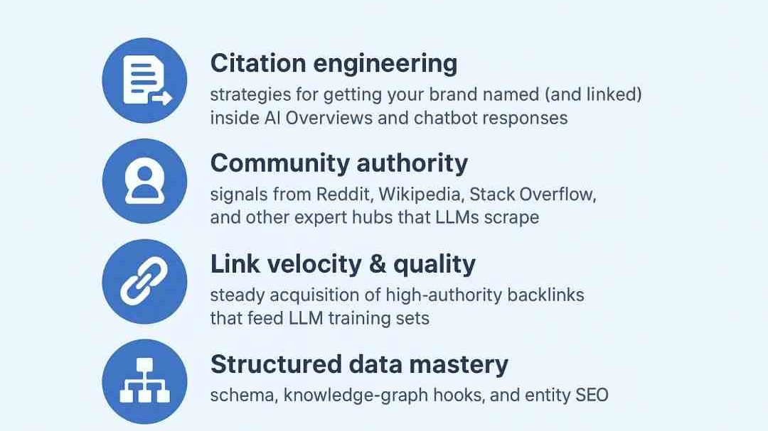 - Citation engineering: strategies for getting your brand named (and linked) inside AI Overviews and chatbot responses.